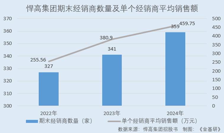 据招股书,2022-2024年各期末,悍高集团境内线家。最近三年,悍高集团对单个经销商的平均销售收入分别为255.56万元、380.90万元、459.75万元。