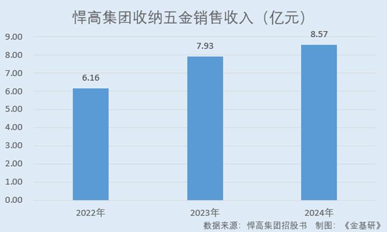 据招股书,2022-2024年,悍高集团收纳五金产品销量分别为327.55万件、408.29万件、436.00万件,销售收入分别为6.16亿元、7.93亿元、8.57亿元。