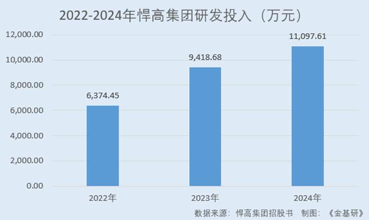 据招股书,2022-2024年,悍高集团的研发投入分别为6,374.45万元、9,418.68万元、11,097.61万元。悍高集团最近三年累计研发投入金额为2.69亿元,占最近三年累计营业收入的比例为4.01%,最近三年研发投入CAGR为31.95%。