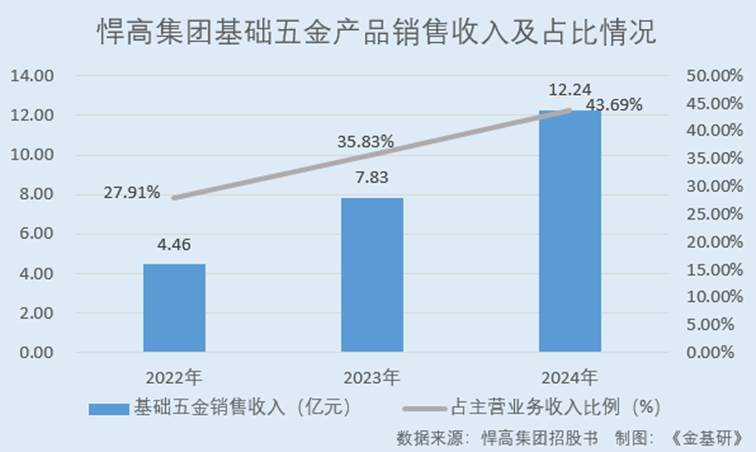 据招股书,2022-2024年,悍高集团基础五金产品销量分别为0.82亿件、1.50亿件、2.56亿件,销售收入分别为4.46亿元、7.83亿元、12.24亿元,占主营业务收入的比例分别为27.91%、35.83%、43.69%。